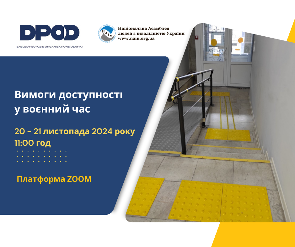 20-21 листопада 2024 року Національна Асамблея людей з інвалідністю України (НАІУ) за підтримки Організації людей з інвалідністю Данії (DPOD) проводить дводенний вебінар про те, як забезпечити доступність закладів у сучасних умовах. Захід стане цінним джерелом інформації для всіх, хто прагне зробити свої установи безбар’єрними та доступними для людей з інвалідністю. 20 листопада зустріч розпочне Улла […]
